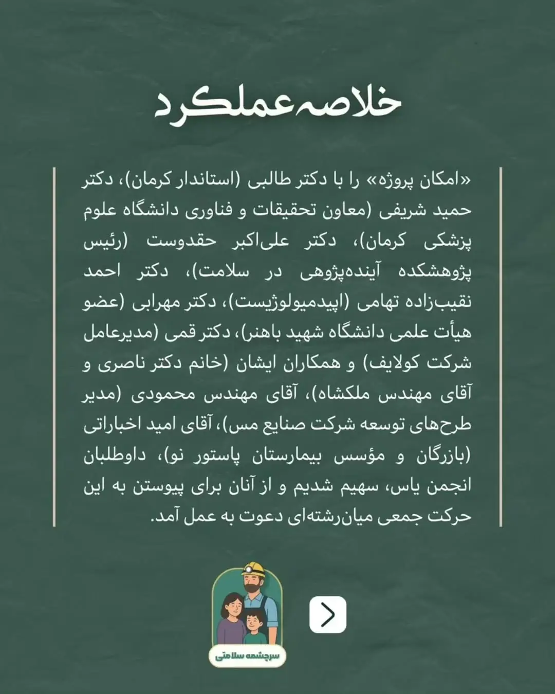 «امکان پروژه» را با دکتر طالبی استاندار کرمان)، دکتر حمید شریفی (معاون تحقیقات و فناوری دانشگاه علوم پزشکی کرمان دکتر علی اکبر حقدوست (رئیس پژوهشکده آینده پژوهی در سلامت)، دکتر احمد نقیب زاده تهامی اپیدمیولوژیست) دکتر مهرابی (عضو) هیات علمی دانشگاه شهید باهنر دکتر قمی (مدیر عامل شرکت کولایف و همکاران ایشان (خانم دکتر ناصری و آقای مهندس ملکشاه آقای مهندس محمودی (مدیر طرحهای توسعه شرکت صنایع مس آقای امید اخباراتی (بازرگان و موسس بیمارستان پاستور نو)، داوطلبان انجمن پاس، سهیم شدیم و از آنان برای پیوستن به این حرکت جمعی میان رشته ای دعوت به عمل آمد.